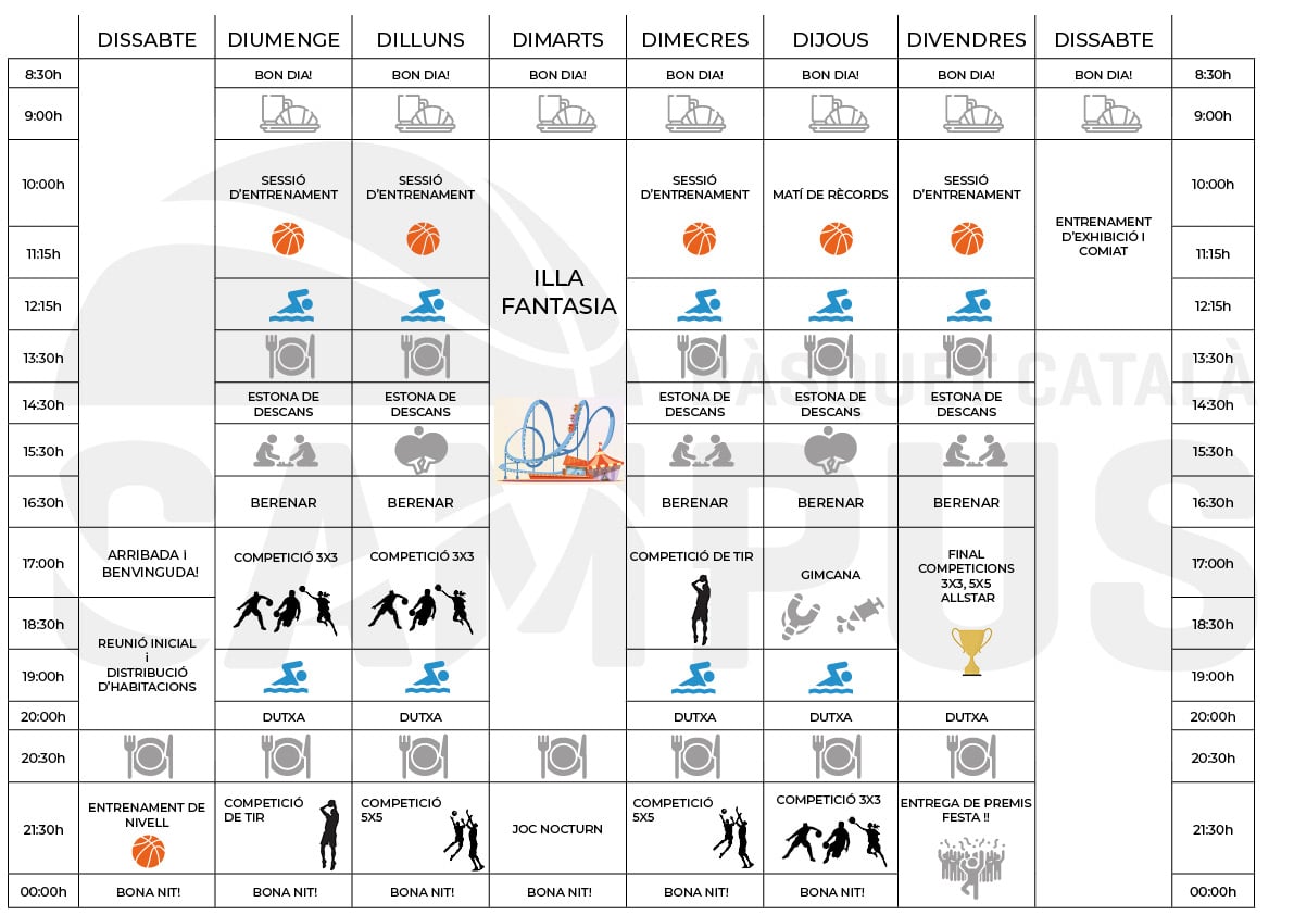 Al llarg de la setmana, combinarem el bàsquet amb dinàmiques, jocs i propostes en grup que ajuden a crear un gran ambient, fer noves amistats i mantenir l’energia i les ganes cada dia.