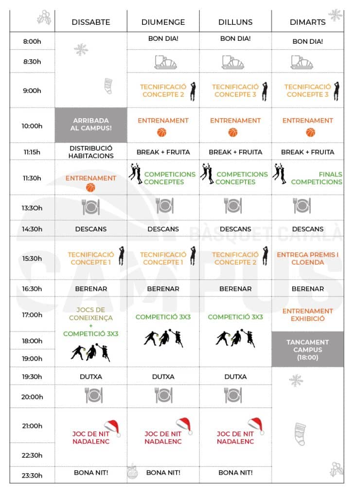 Del dissabte 27 al dimarts 30 de desembre, els participants gaudiran de quatre dies i tres nits a la casa de colònies El Pinatar, on viuran una autèntica immersió en el món del bàsquet envoltats de natura i bon ambient.